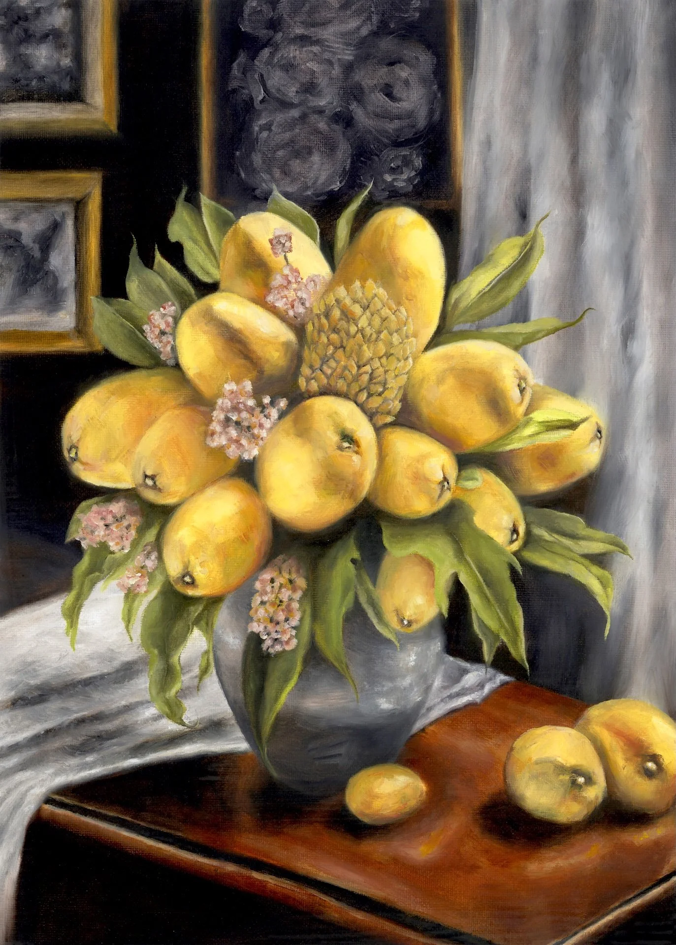 My inspiration for my themes have been still life, often drawn from objects in my home. I love to look around for what would give an empty wall space some life and color. I was born and raised in Puerto Rico, and that is where my island theme paintings come from.