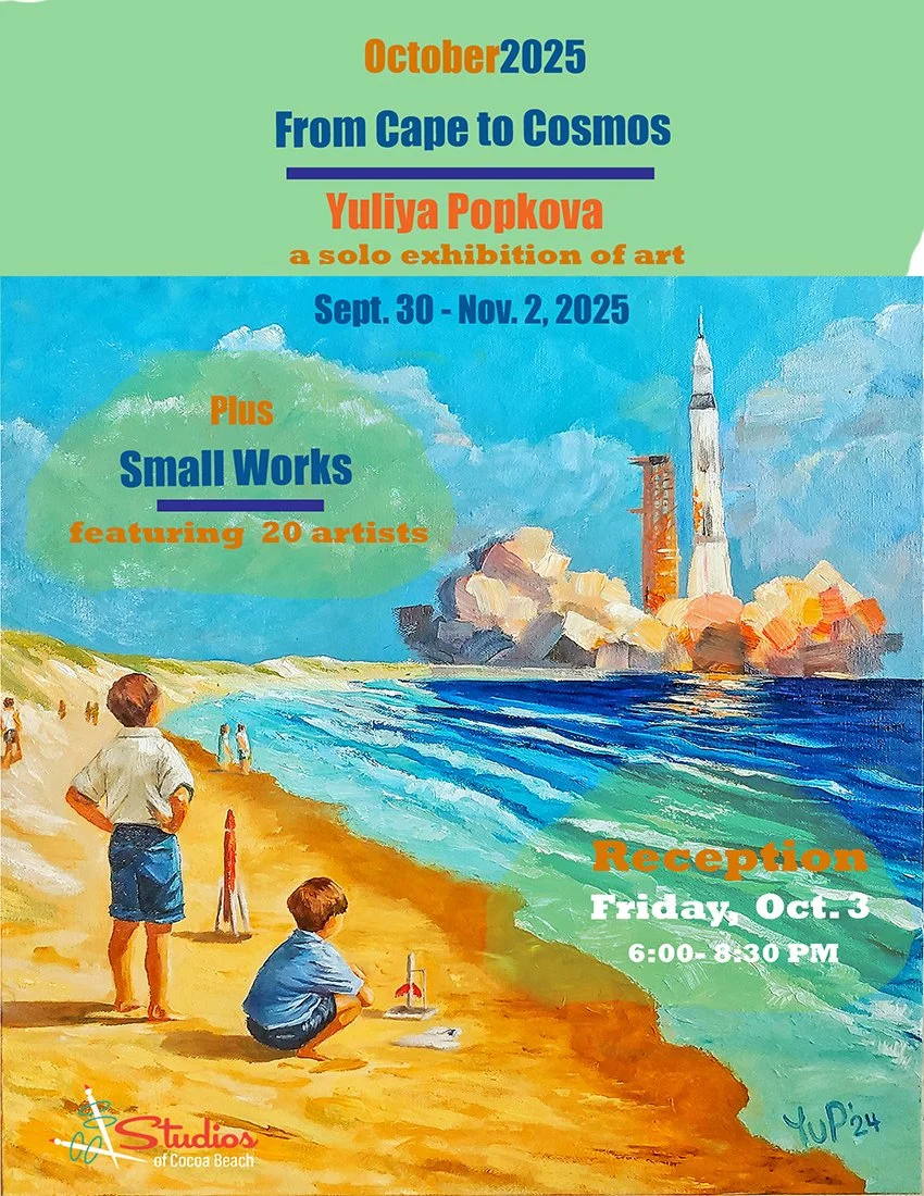 Join us for the reception on Friday, October 3, 2025, from 6:00 to 8:30 pm at Studios of Cocoa Beach. This event offers a wonderful opportunity to meet Yuliya Popkova and the other artists, experience the stunning range of works on display, and celebrate the vibrant cultural scene thriving in Brevard County.